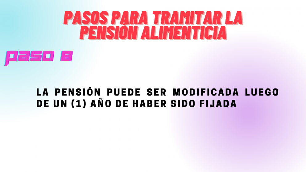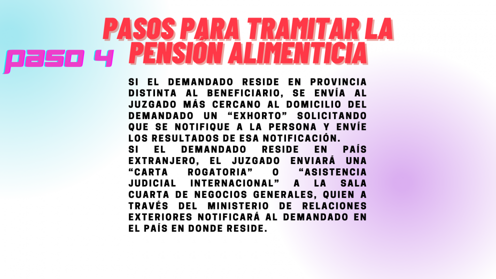 Paso 1: El usuario debe retirar en los Centros de Información y Atención al Ciudadano (CIAC) o en cualquier Juzgado de Niñez y Adolescencia, Juzgado Municipal de Familia, o Juzgado Municipal Mixto, los requisitos y solicitud para iniciar el proceso de pensión alimenticia y lo presenta al Registro Único de Entrada (RUE). De igual forma, puede solicitar la información a los facilitadores judiciales de su comunidad.Se debe presentar el proceso ante el RUE o juzgado que corresponde al área donde vive la persona que va a recibir la pensión alimenticia.Paso 2: El Registro Único de Entrada (RUE) recibe la solicitud de pensión alimenticia, lo reparte y entrega al despacho judicial determinado.De no contar con registro único de entrada, el trámite se presenta ante el Juzgado de Niñez y Adolescencia, Juzgado Municipal de Familia, o Juzgado Municipal Mixto en turno.Paso 3: El juzgado le da entrada al expediente y procede a admitirlo mediante una resolución denominada “auto”.Existen casos en que puede no admitirlo, ya sea por falta de competencia del juzgado o porque existe un conocimiento previo del caso.A su vez, puede ordenar la corrección de la solicitud por defectos de forma o falta de requisitos. Si el usuario interesado no corrige, la solicitud se archiva.Escenario alternativo: Los usuarios podrán ir voluntariamente, si guardan buena relación, a la vía de mediación judicial; el juez podrá proponer la mediación y el expediente será enviado a través de un formulario de derivación al Centro de Mediación Judicial.Paso 4: Admitida la demanda se procederá a realizar las notificaciones:Se gira boleta de citación a cargo del demandado.Si el demandado reside en la misma provincia que el beneficiario, se hará por medio de notificador del Centro de Comunicaciones Judiciales (CCJ), mismo que notifica de forma personal a ambas partes. De no haber CCJ, el personal de despacho procede a notificar de forma personal.Si el demandado reside en provincia distinta al beneficiario, se envía al juzgado más cercano al domicilio del demandado un “Exhorto” solicitando que se notifique a la persona y envíe los resultados de esa notificación.Si el demandado reside en país extranjero, el juzgado enviará una “carta rogatoria” o “asistencia judicial internacional” a la Sala Cuarta de Negocios Generales, quien a través del Ministerio de Relaciones Exteriores notificará al demandado en el país en donde reside.Paso 5: De no haber sido notificada las partes, en caso de renuencia injustificada a la citación, se expide orden de conducción la cual se hará efectiva a través de la Policía Nacional.Al momento de comparecer el demandado se le notificará de la admisión de la demanda y de la fecha de audiencia.Luego de notificadas ambas partes, se procede a la celebración de la audiencia en el juzgado.Paso 6: Audiencia: Declarada abierta la audiencia, el juez procede a conciliar a las partes, mismas que pueden llegar a un acuerdo que será homologado por el tribunal.De no haber acuerdo, las partes presentarán sus pruebas y el juez fijará pensión luego de celebrado el acto de audiencia.Paso 7: La pensión será provisional si se considera necesario la práctica de pruebas adicionales.Luego de practicadas las mismas, se fijará pensión definitiva.Paso 8: La pensión puede ser modificada luego de un (1) año de haber sido fija da.