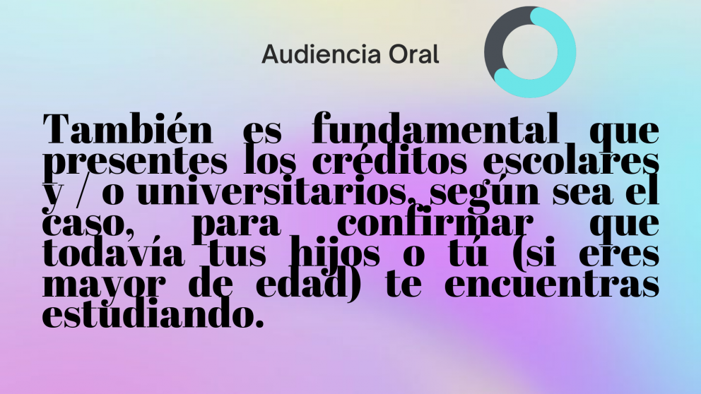 Audiencia oral En esta parte del proceso es importante que puedas presentar todas las pruebas que tengas y que den fe de tus gastos o los gastos que tengas para con tus hijos; por ejemplo, facturas de supermercado, de agua, recibos de luz, vestimenta, gastos médicos, pagos de matrícula de universidad, libros, transporte, gastos escolares, etc. También es fundamental que presentes los créditos escolares y / o universitarios, según sea el caso, para confirmar que todavía tus hijos o tú (si eres mayor de edad) te encuentras estudiando. Cuando ya tengas todas estas pruebas en tus manos, entonces puedes ir a los juzgados Municipales de familia, ubicados en Ancón o incluso ante los Jueces de Paz de tu comunidad. Si asistes a los juzgados, cuando llegues e informes qué proceso es el que vas a realizar, los funcionarios te entregarán un formulario que debes llenar y presentar junto con el certificado de nacimiento y la copia de tu cédula.